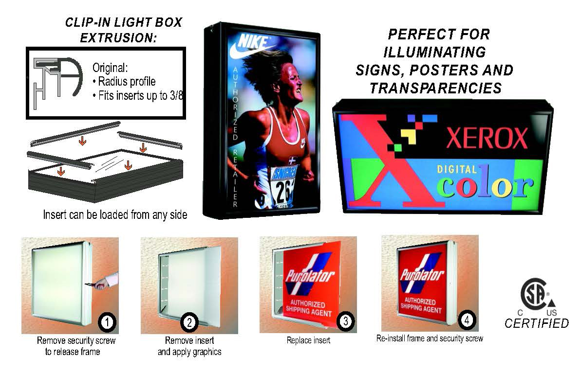 Custom light boxes can be ordered in both black painted or clear satin anodized finishes. Used with signs or transparencies etc. the Clip-in box illuminates the selected media with smooth, even light. Simply add graphics and slide insert in.