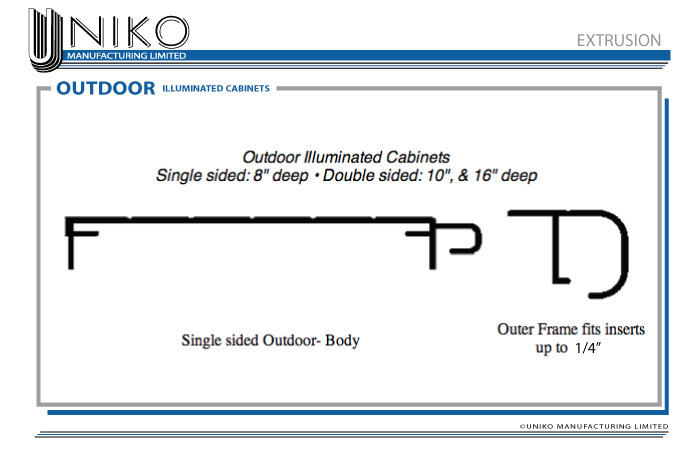 The exterior illuminated cabinet is a strong, durable, extruded aluminum outdoor signage solution boasting excellent outdoor performance. The solid, one-piece outer frame holds signage substrates up to ¼” thick and lifts up on hinges. Making maintenance and graphics exchange very easy.